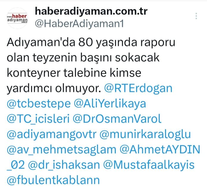 “Kimse duymuyor! Adıyaman’da 80 yaşında teyzenin başını sokacak konteyner talebine kimse yardımcı olmuyor” haberimiz üzerine harekete geçen Milletvekili Doç. Dr. İshak Şan, yaşlı teyzenin mağduriyetini giderdi.