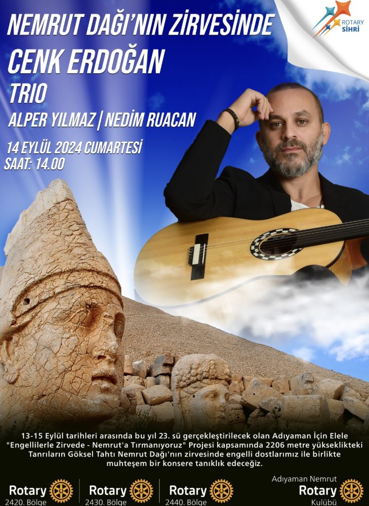 Adıyaman Nemrut Rotary Kulübü tarafından her yıl düzenlenen ve bu yıl 23.’sü gerçekleştirilecek olan Adıyaman için Elele “Rotary Engellilerle Zirvede – Nemrut’a Tırmanıyoruz” projesi kapsamında 14 Eylül tarihinde Nemrut Dağı’nın zirvesinde bir konser düzenlenecek. Bu önemli organizasyonda Dünya’ca ünlü Gitar Sanatçısı Cenk Erdoğan Trio Alper Yılmaz ve Nedim Ruacan Konseriyle Engellileri Nemrut Dağının zirvesinde buluşturacağız.