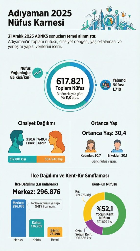 31 Aralık 2025 itibarıyla Adrese Dayalı Nüfus Kayıt Sistemi (ADNKS) verileri de bu dönüşü net bir şekilde ortaya koyuyor. Adıyaman’ın nüfusu, bir önceki yıla göre yüzde 11 artarak 617 bin 821’e ulaştı.