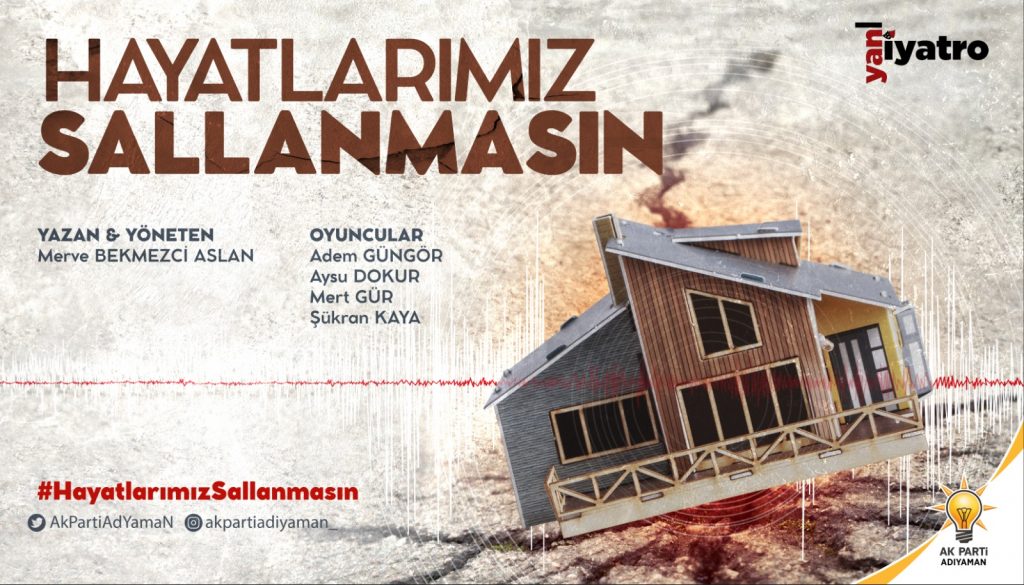 AK Parti Adıyaman İl Başkanlığı, “Hayatlarımız Sallanmasın” tiyatro oyunuyla şehir genelinde deprem farkındalığını artırmayı amaçlıyor. Oyunun gösterimi 29 Mart Salı Günü Saat 13:00’da (3 seans) Belediye Konferans Salonu’nda sahnelenecek