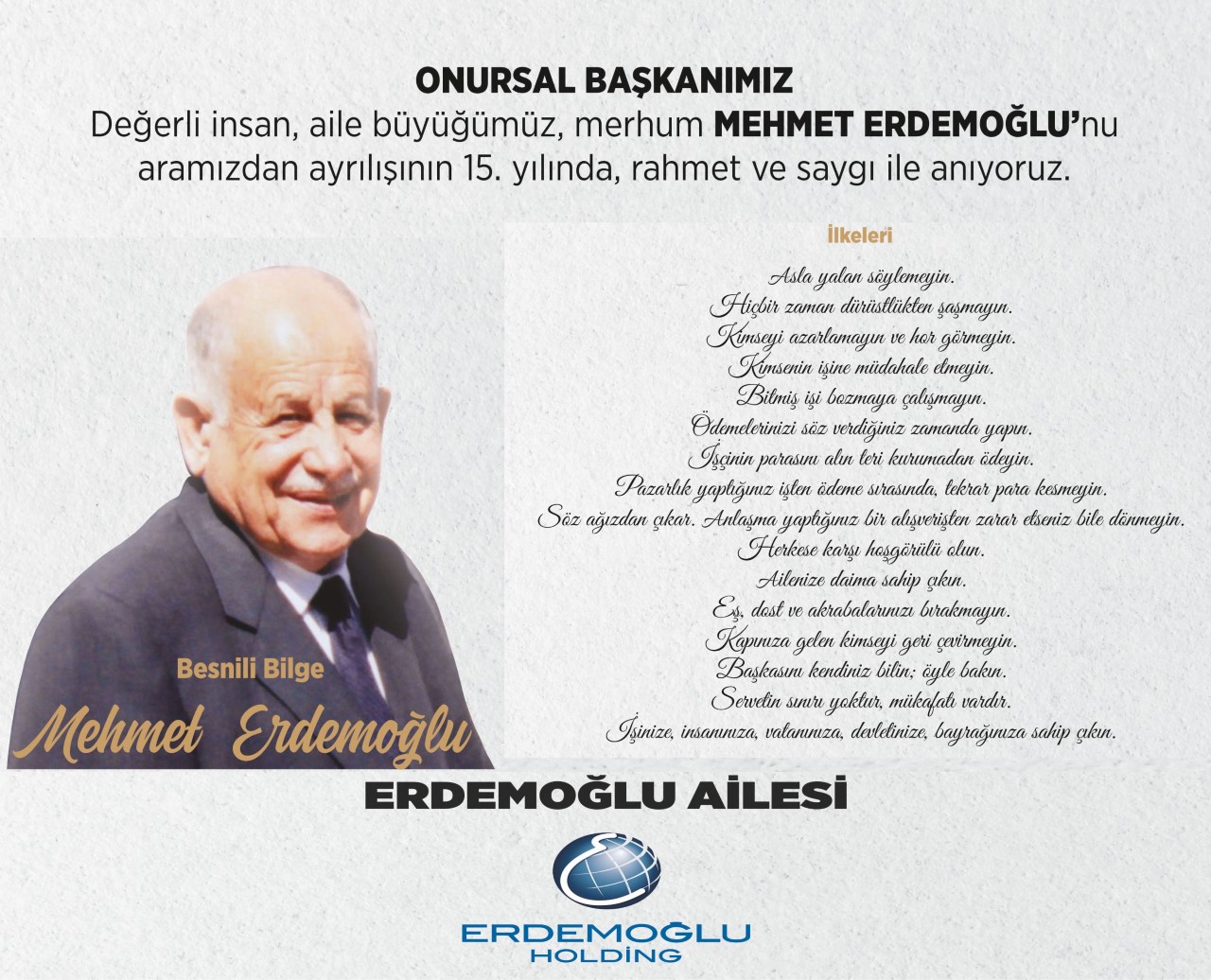 İlanında, “Onursal Başkanımız, değerli insan, aile büyüğümüz, merhum Mehmet Erdemoğlu’nu aramızdan ayrılışının 15.yılında rahmet ve saygı ile anıyoruz.” ifadelerine yer verenErdemoğlu Ailesi, Mehmet Erdemoğlu’nun ilkelerini de paylaştı.
