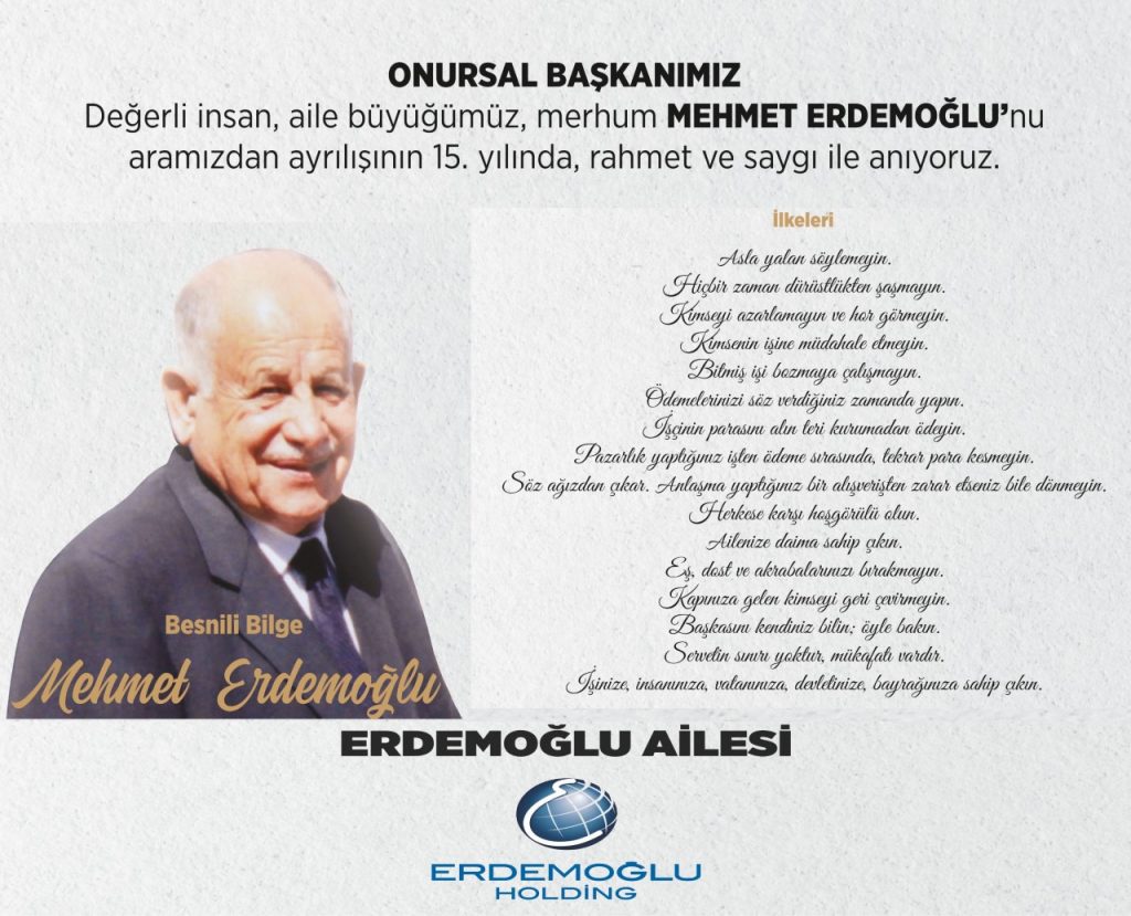 İlanında, “Onursal Başkanımız, değerli insan, aile büyüğümüz, merhum Mehmet Erdemoğlu’nu aramızdan ayrılışının 15.yılında rahmet ve saygı ile anıyoruz.” ifadelerine yer veren Erdemoğlu Ailesi, Mehmet Erdemoğlu’nun ilkelerini de paylaştı.